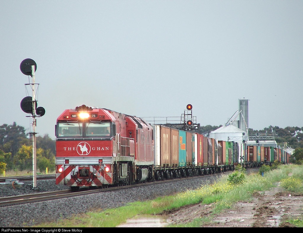 | NR75-AN3 painted in a special Ghan Livery, power away from Lara on an Adelaide - Brisbane freight.