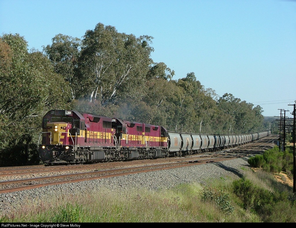 | L251-L270-L254 climb upgrade between Broadford & Tallarook on an empty grain train as it heads back to Southern New South Wales to be filled. Click Here to view more aussie photos at my Fotopic site. |
