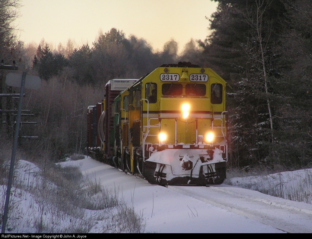 Just moments after dawn, and with ambient temperatures hovering around 0 degrees F, New Brunswick Southern freight #902 thunders eastbound out of Brownville Jct., ME. The power for this day's lengthy consist was NBSR 2317-2318-2319-9803, elephant-style.
