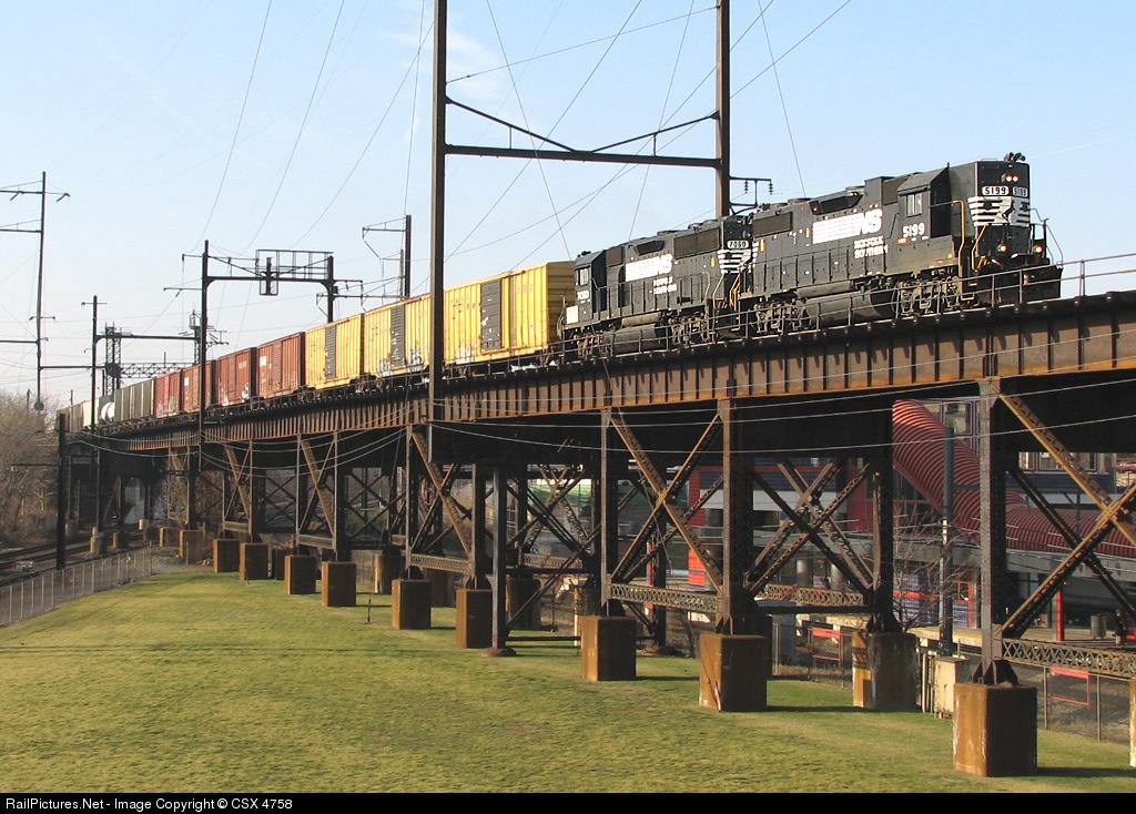 | NS local H5A heads west over the high line out of South Philly Yard en route to NS Abrams Yard behind a pair of high hood geeps on a bright morning; train is cruising over Septa's University City Station below. |