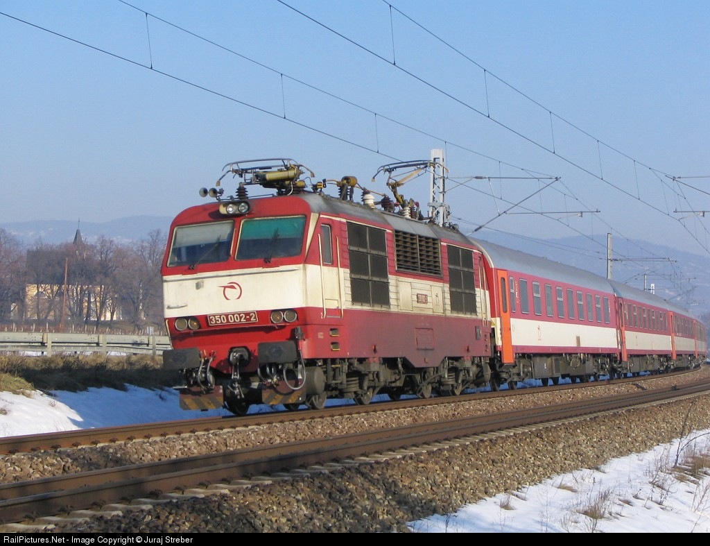 | An international InterCity from Kosice and Zilina is arriving to Bratislava from where it will continue to Vienna, coupled behind one of the two red-schemed 350 prototypes. |