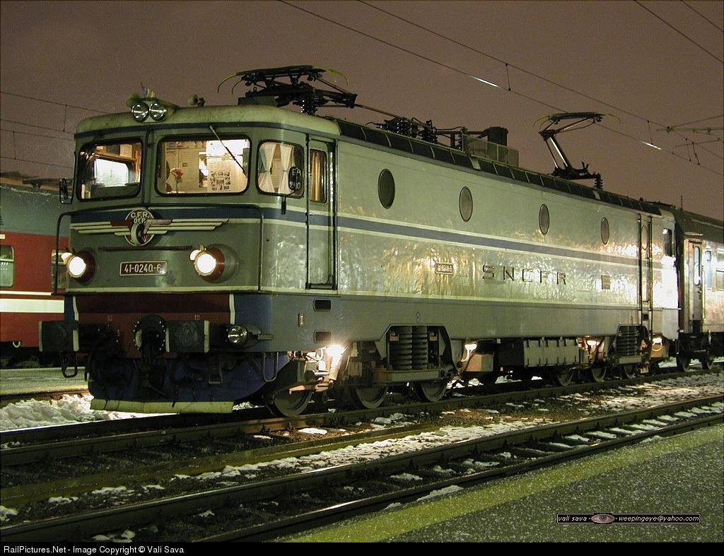| Romanian electric locomotive (ASEA license, 5100 kW) belonging to Brasov Depot, in old grey-blue livery. |