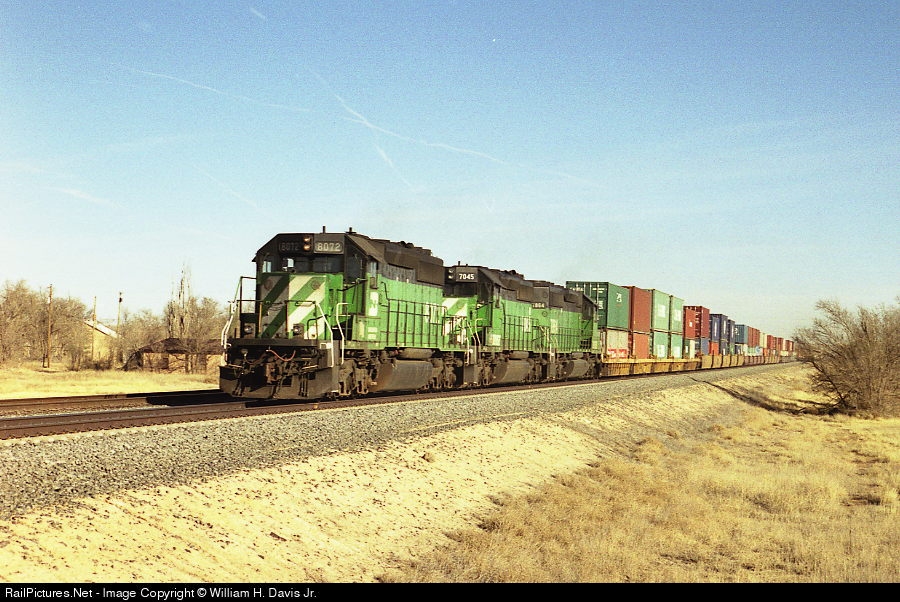 | BNSF Westbound Doublestack Train at Encino, NM. on BNSF'S Clovis Sub with a trio of BN Cascade Green SD40-2'S for power |