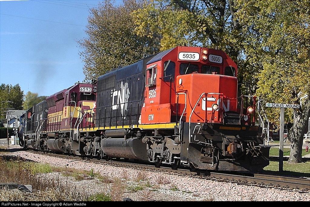 | CN/GTW 5935 leads an eastbound through Scales Mound . Notice the sign to the right of the train. There are signs like this on the Iowa Division that have the old CCP herald on them. It is said they will be replace with ones that have the CN logo on them. |