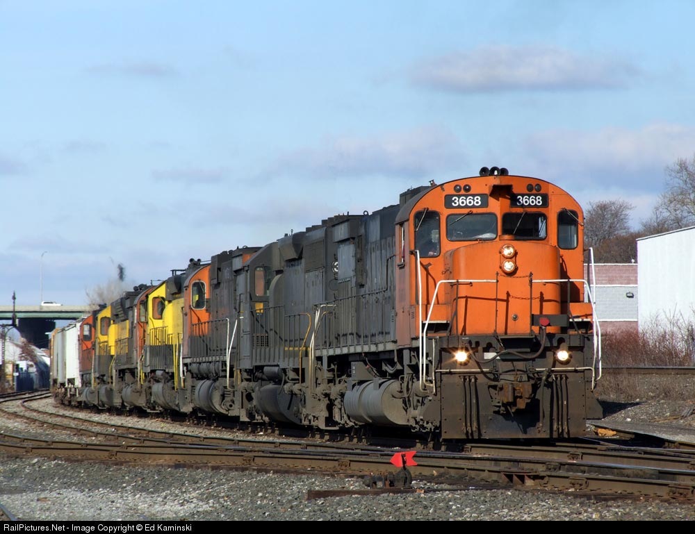 | NYSW eastbound roadfreight SU-100 arrives in Ridgefield Park NJ behind NYSW 3668, an ex-Cartier MLW M636, and other EMD/MLW power. |