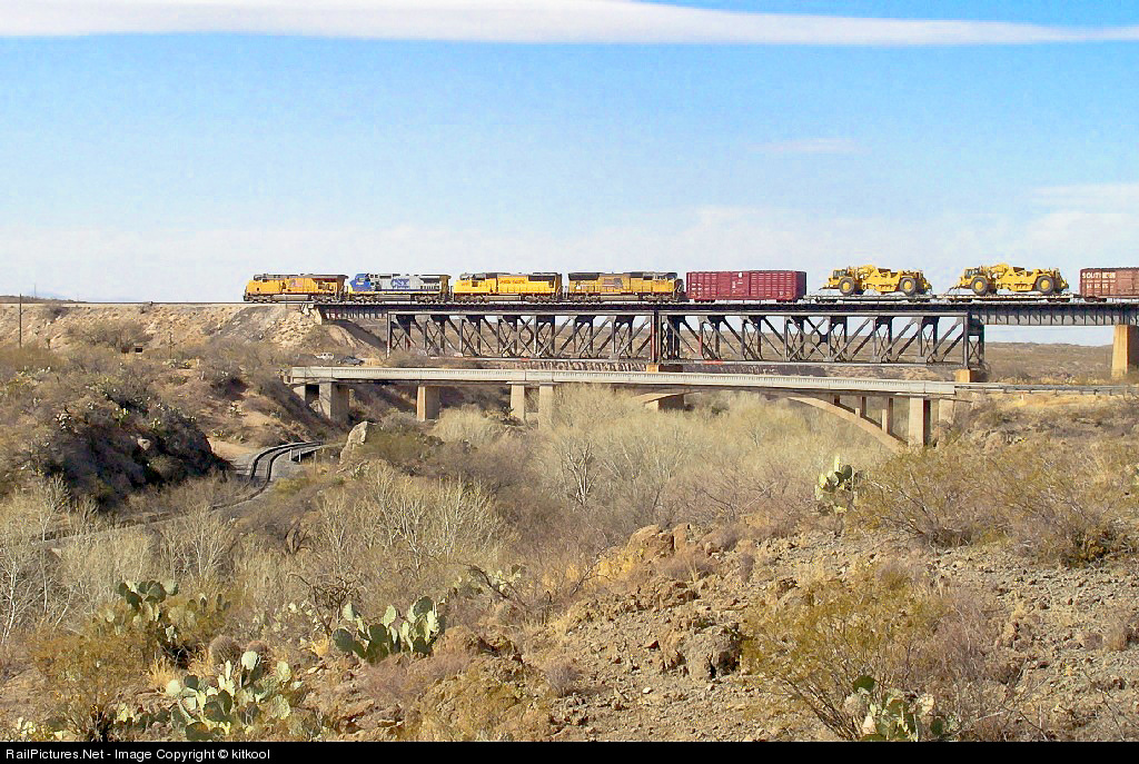| Union Pacific 5399 C45ACCTE Leading a west bound manifest freight on main #1 over the Cienega Creek Bridge. Eastbound main track #2 snakes below the Bridge as the #2 track follows the contours of Cienega Creek. |