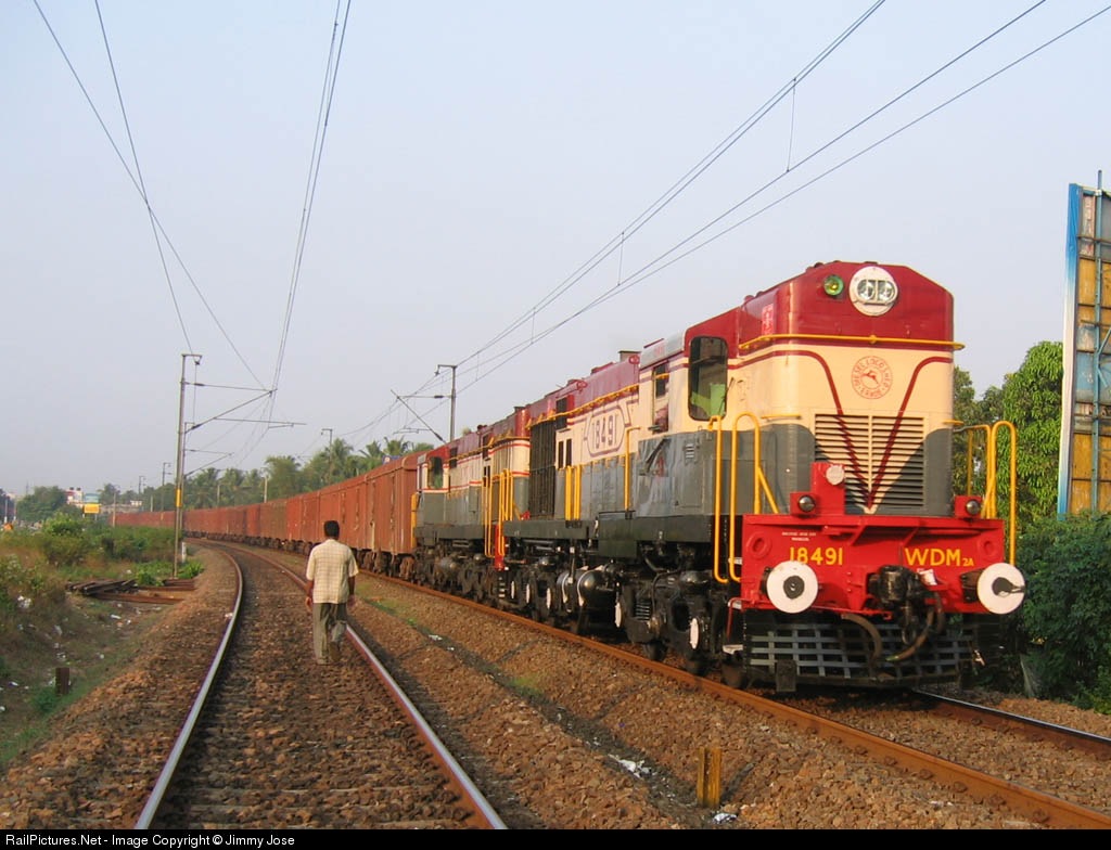 | Twin headed freight headed by Erode WDM 2 twins 18491 and 17710 rumbles past. A solitary man walking on the track pay no attention to the mighty freight passing next to him. Where else in the world could you walk so casually on the tracks :-) |