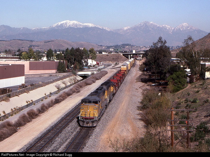 An SD60M and an SD40-2 power a westbound at Spadra. In the background are the 57 Freeway and 3 of the tallest peaks in the San Gabriel mountain range, including Mt. Baldy, Ontario Peak, and Cucamonga Peak.