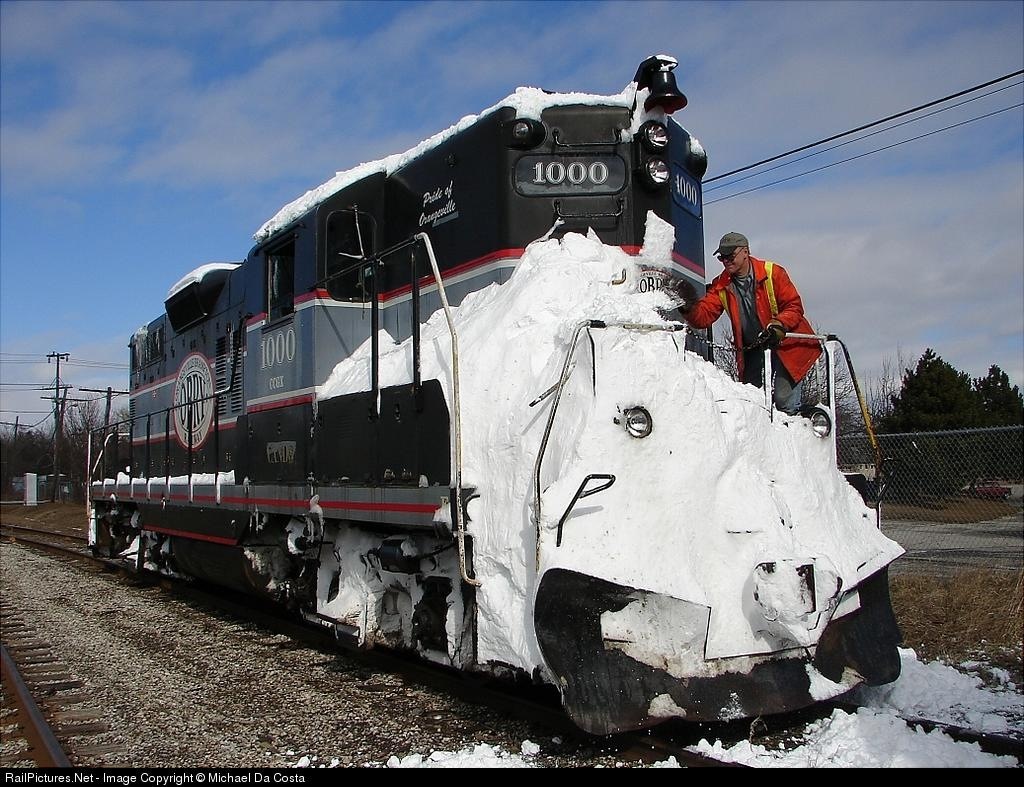 OBRY GP9 1000 pauses at Streetsville as the engineer starts to kick away the snow from the front of the locomotive after encountering a huge snow drift in Orangeville.