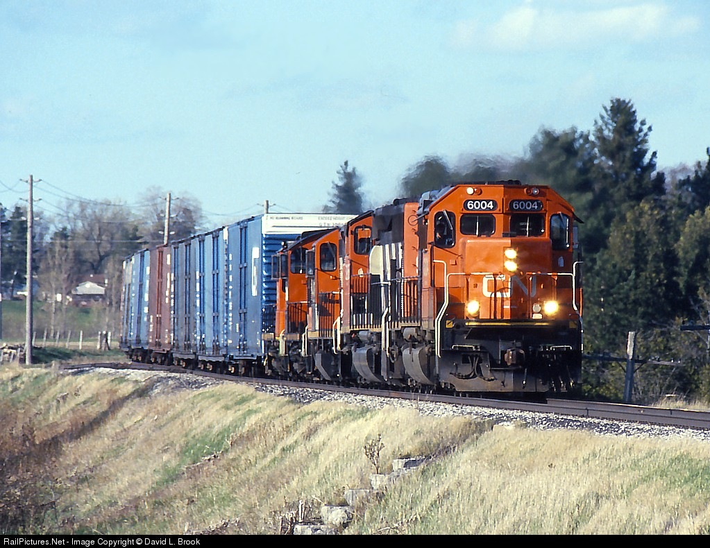 | A wild collection of CN power goes west(SD40U, SD40-2, GP9. 2 SW1200's) |