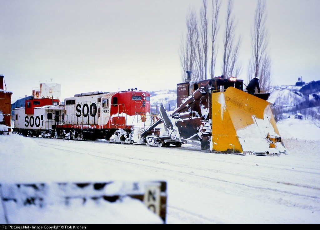 | Soo 2550 and Jordan Spreader D-816 are clearing snow from the East Houghton yard in March of 1976. Snowfall in this part of Michigan averages 190 inches a year. A record 390.4 inches of snow fell in the winter of 1978-79. |