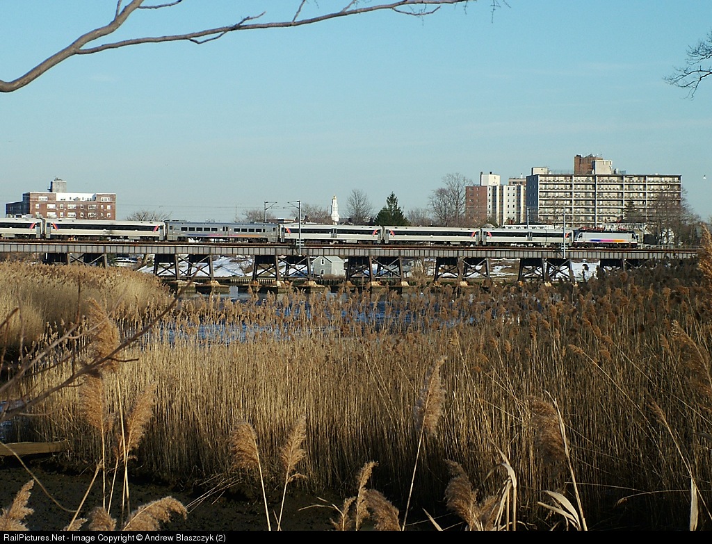 NJT 4617 is at the end of this northbound train crossing over the Navesink River at Red Bank. Can you find the sea gull at the right side of the photo?