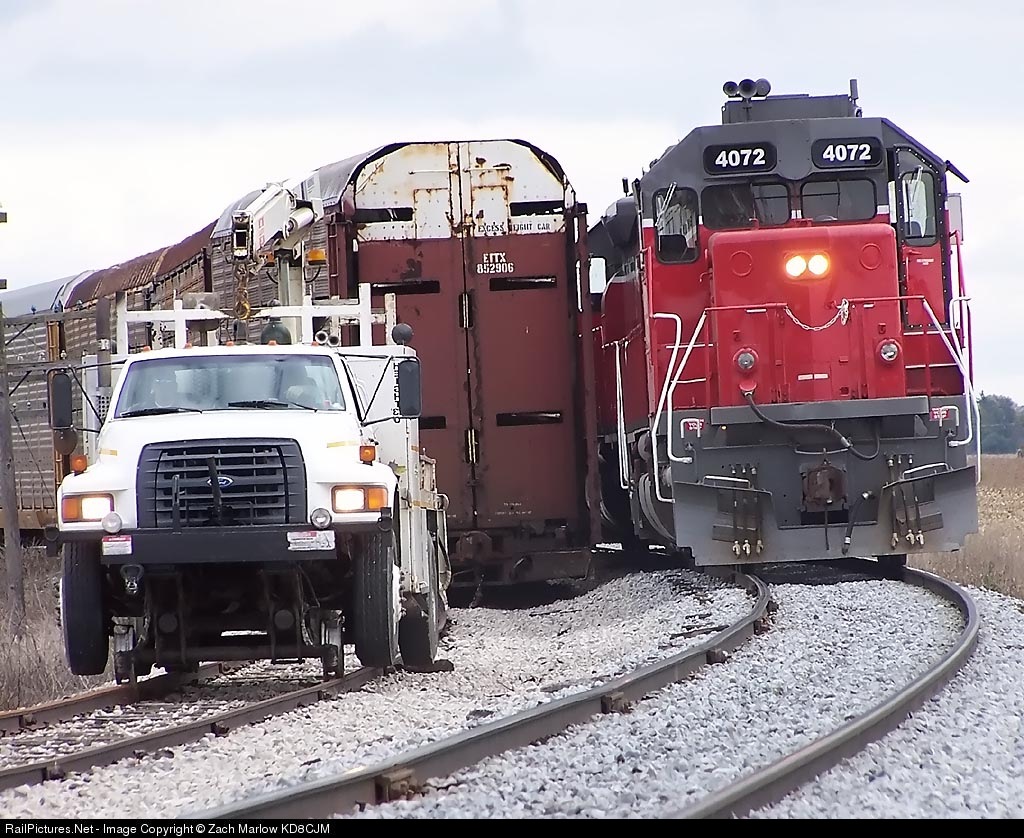 | IORY 4072 inches by a derailed autorack to get on the southside and pull the rack back up onto the rails as an Atlas HiRail truck backs down the siding to chain up to the rack. Derailment occured after 400 and 401 met at Quincy and 401 began to pull north |