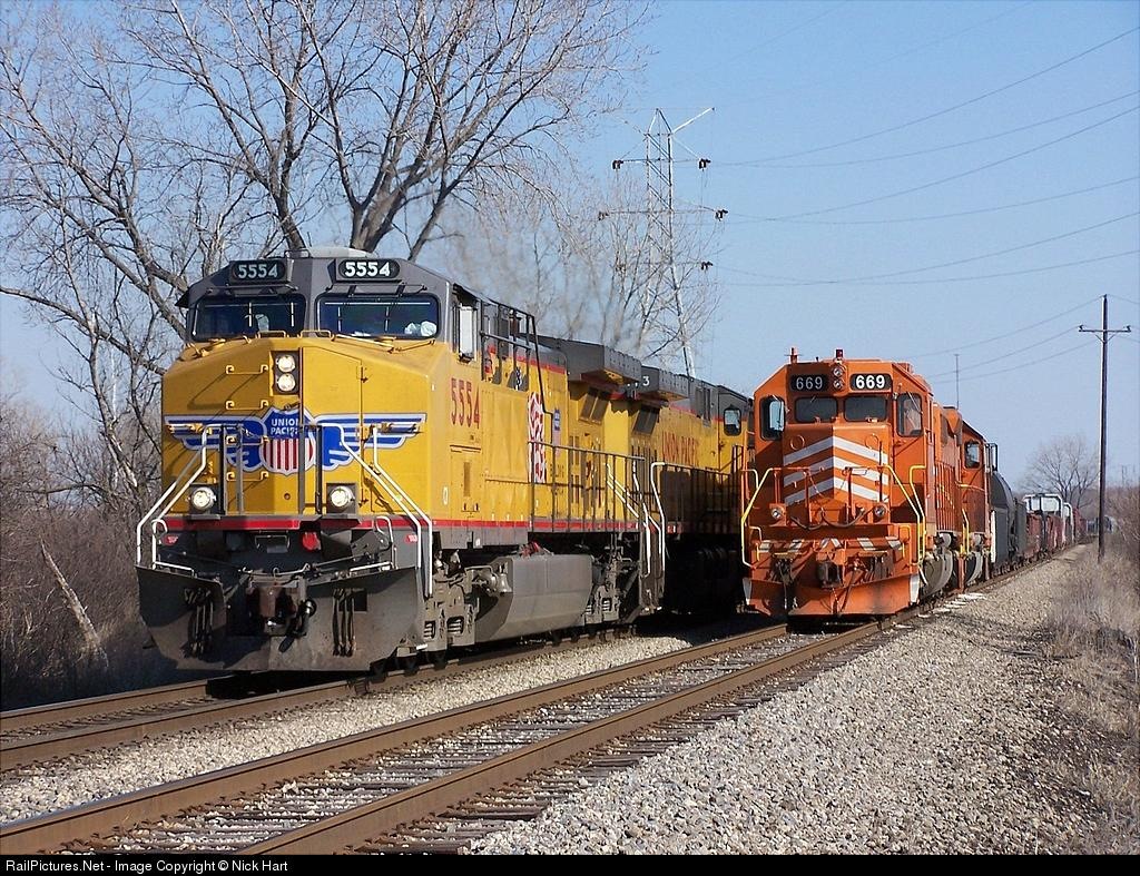 Sparkling UP 5554 passes a stopped EJ&E 669 and 671 at Bridge Junction on the EJ&E Western Sub.