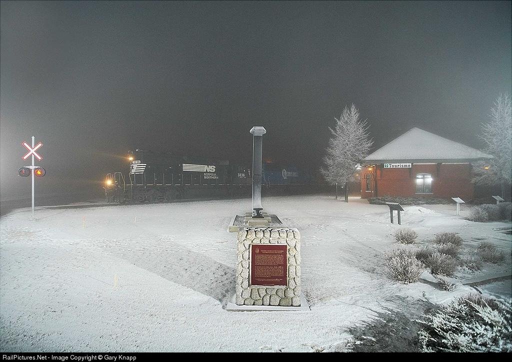 CN 328 Detour behind NS 3236 passes the ex-GT Station in St. Jean. Monument & historic marker commemorate this location where Canada's first railroad was begun in 1835, later to become the first international railroad in North America.