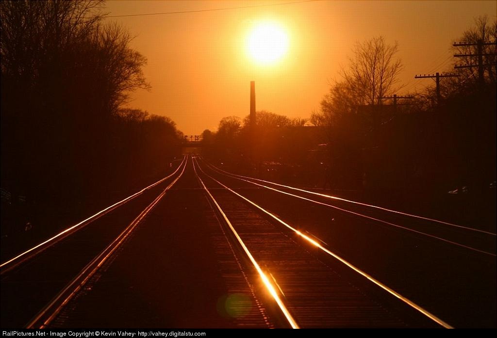 | On a cold, haze free evening, the sun sets over the old BN "racetrack" at the start of another Metra rush hour. |