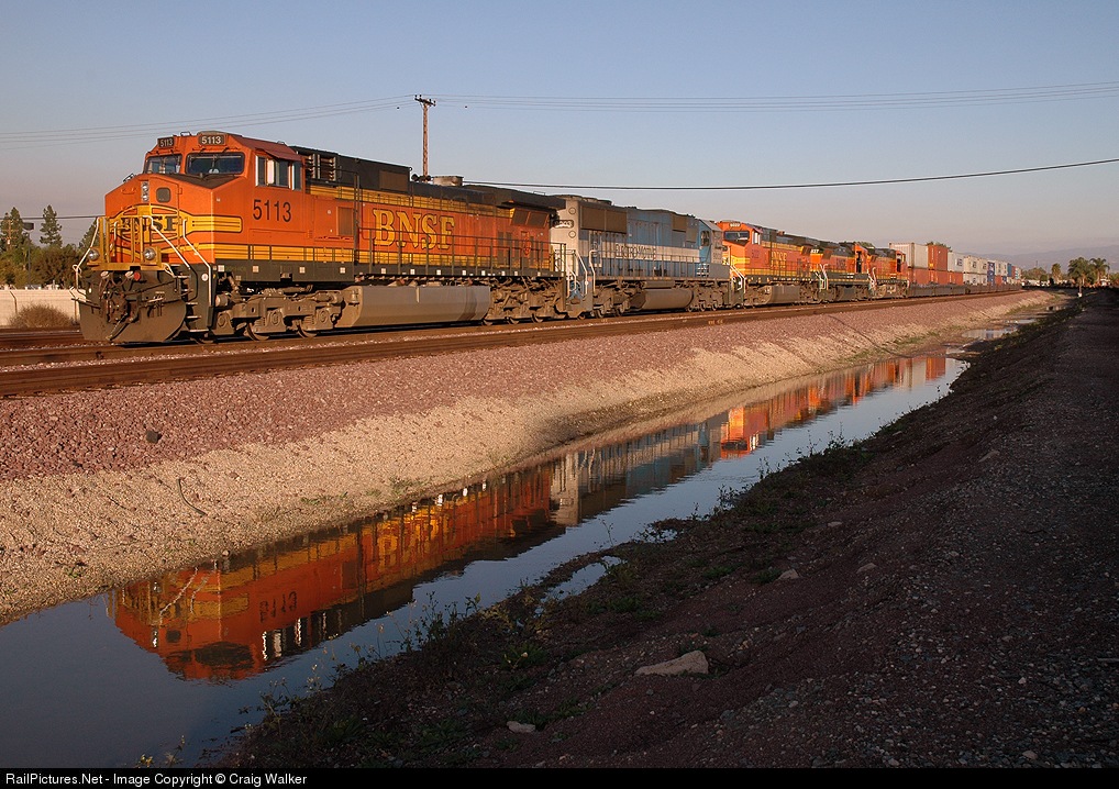 BNSF intermodal train S-KCKSCO1-26, which originated in Kansas City KS and it headed to the Port of Long Beach CA, passes waits at Basta, just west of the Fullerton passenger station, for the evening commuter rush to end so that it can get underway once again. (March 1, 2006)