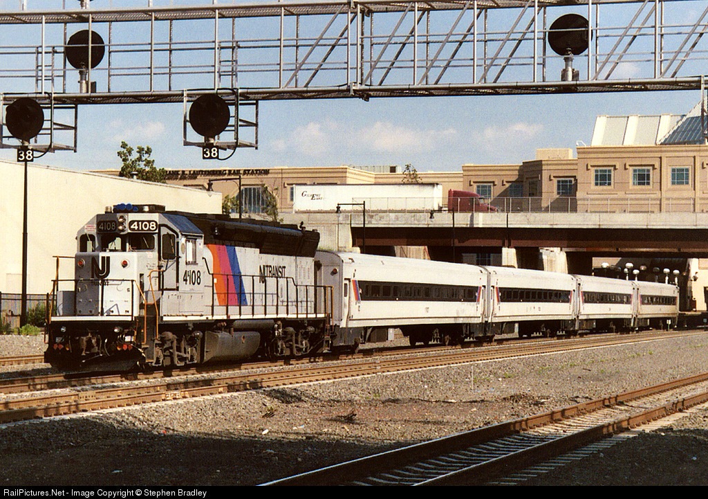 | NJT 4108, an ex-CNJ GP40P unit, leaves Secaucus with a Main Line train. |