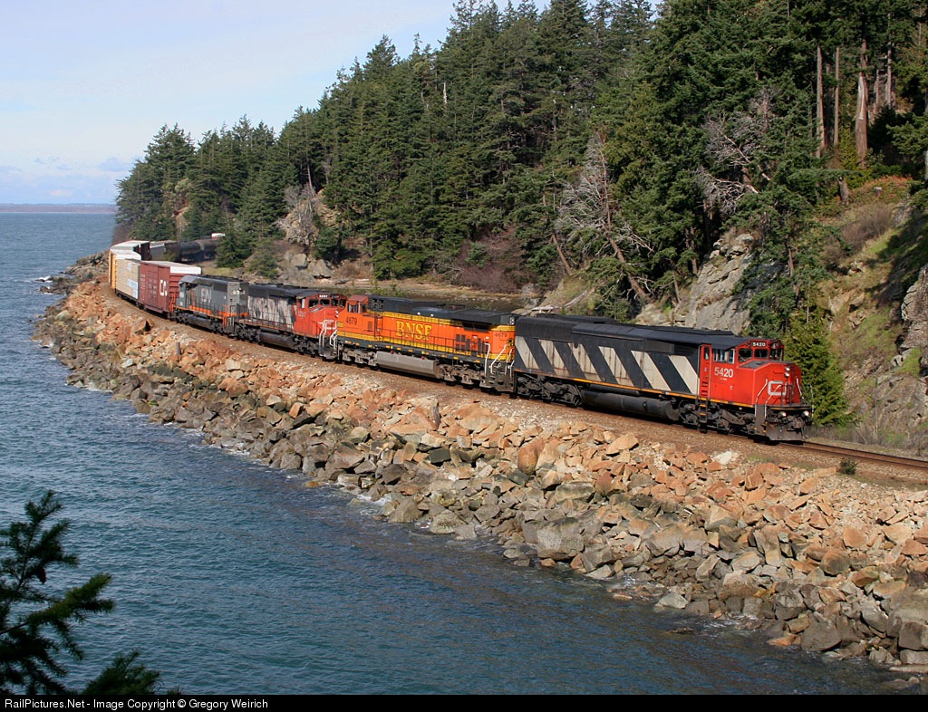 | It's a Canadian invasion. 3 CN locos outnumber the lone BNSF unit on this Edmonton, AB to Everett, WA manifest. This is on BNSF's Bellingham Sub which sees a high number of CN pooln power locos. |