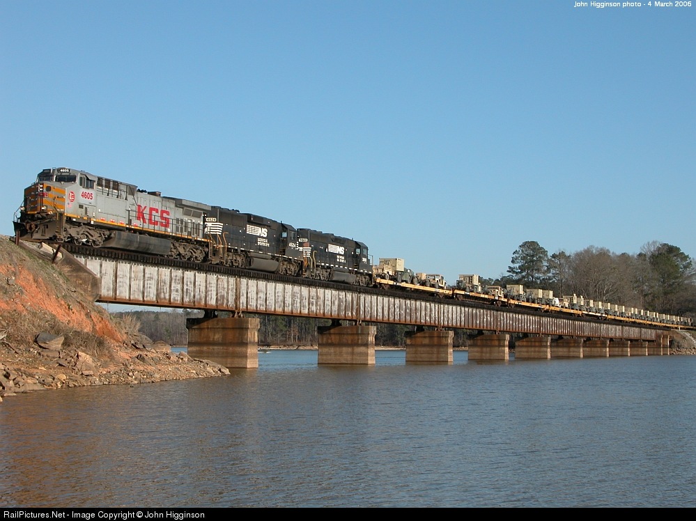NS train 187 sails across the trestle over Lake Martin with a KCS leader and a long string of flats loaded with military vehicles