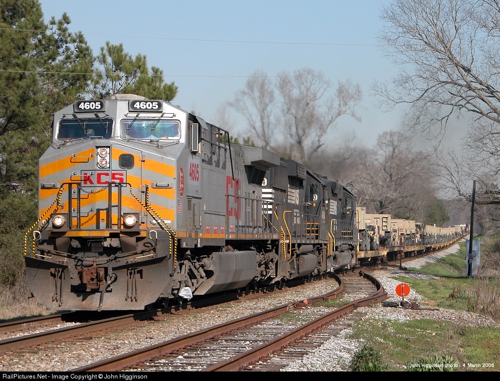| KCS 4605 and two NS Geeps are in charge of 187 as it approaches Opelika with nearly 8000 feet of train, including many loads of military vehicles and equipment right behind the motors |