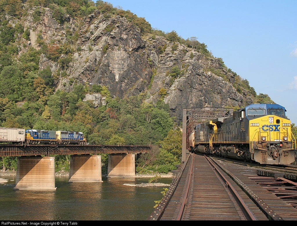 | Westbound K951 "Rock Runner" heads to Millville West Virginia while CSX 6917 waits, on the Cumberland Sub, to drop off one section of CWR. See my profile for more pictures of Harpers Ferry. You can also find out about the sign painted on the mountain. |