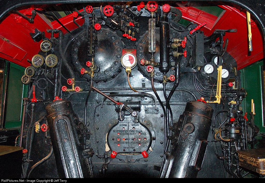 Inside the cab of 60000. Only the pressure gauge is fake (it is used during the "test run"). Note the two large cylinders coming out of the top of the backhead - part of the water tube firebox design.