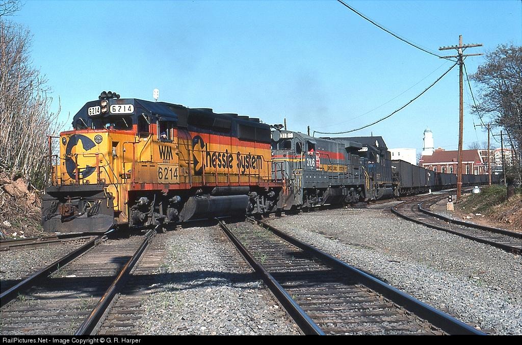 | Former WM GP40-2, now CSXT 6214 in Chessie paint, leads a westbound train of mtys across the diamonds in Charlottesville, VA. |
