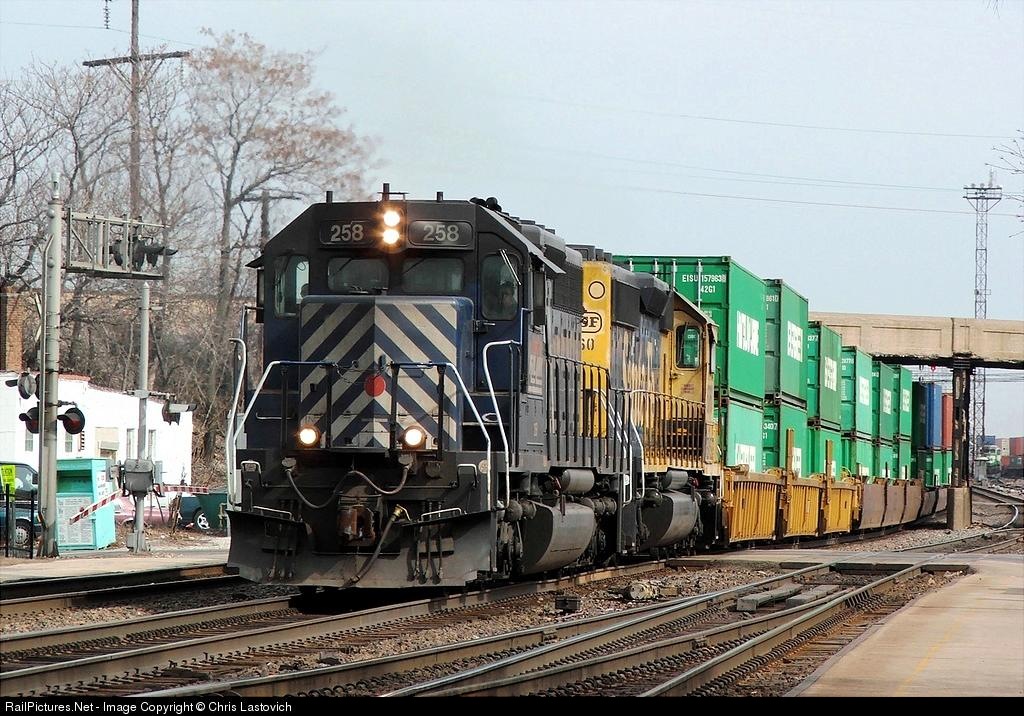 | An MRL 258 on long term lease to the BNSF leads a former ATSF SD40-2 on a Stack Bedford Park, IL to Tacolma, WA (Blair Terminal) train. |