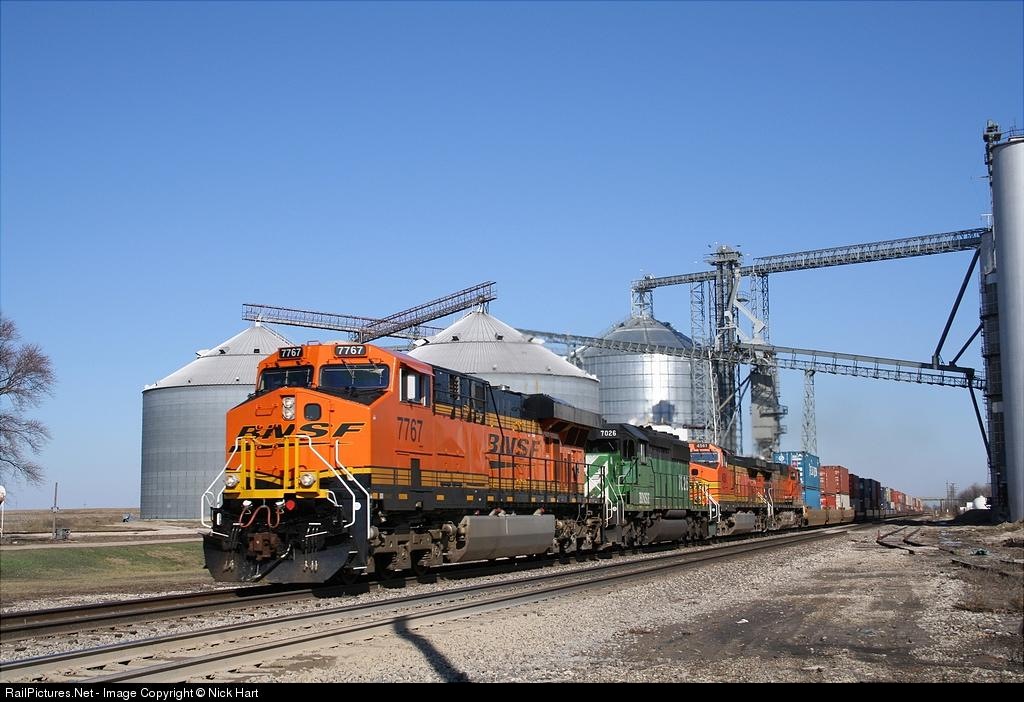 | The good stuff is up front as new logoed GEVO 7767 highballs past the grain elevators at Ransom, accompanied by a BN green SD40-2, and a pair of BNSF Heritage 2 Dash 9's. |