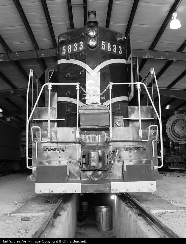 HVSR GP7 No. 5833 sets over the pit inside the shop undergoing maintenance and minor repairs in preparation for the 2003 operating season.