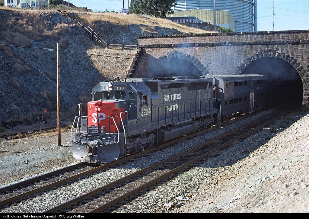 | Southern Pacific SDP45 3204 pulls gallery cars on eastbound (southbound) commute #130, as it exits a tunnel in San Francisco, California. |