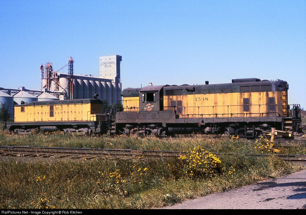| CNW GP7 1548 and slug BU-2 are working the interchange yard at the waterfront at Superior, Wisconsin, in August of 1976. |