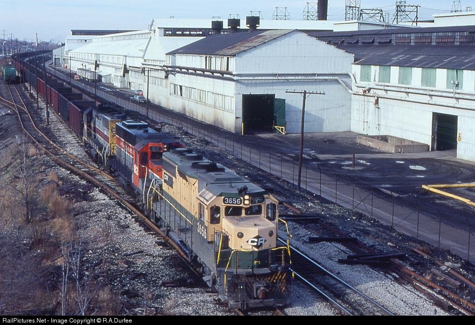 | A colorful ex Reading,BAR,ex Erie Lackawanna set passes some of the steel mill buildings in Youngstown. |