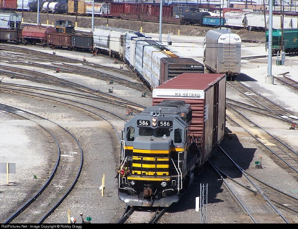 BRC GP38-2 #586 pulls a long string of cars as it switches the huge Clearing Yard. Notice the BRC SW1500 above the cars of the train in the background.