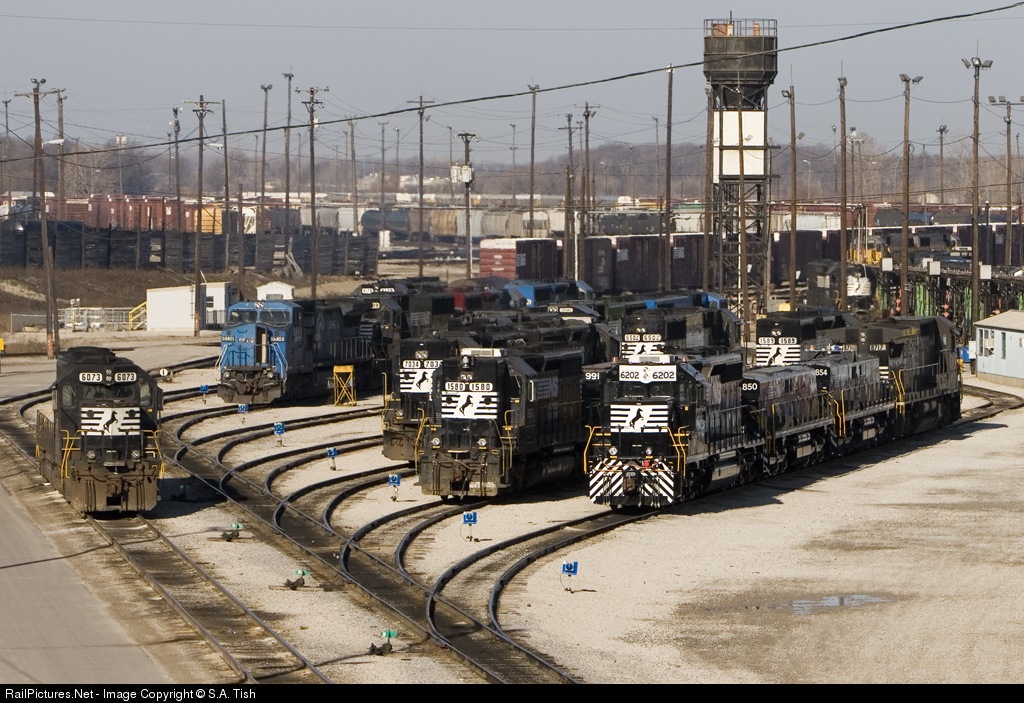 | A little bit of everything from road engines to hump engines await duty at the Bellevue diesel pit. A very rare SD50S 6502 sits in the middle of the bunch. |