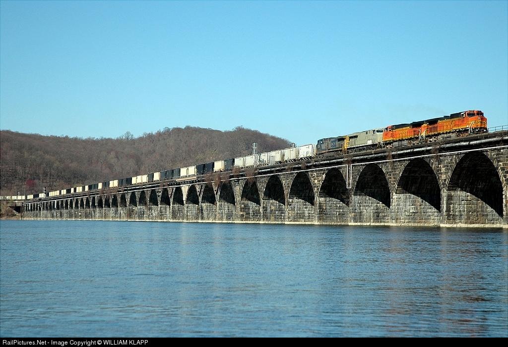 | Eastbound with Engines BNSF 5457 , (GE 44-9W) NS 7517 , ( ES40DC ) , CSX 429 , (AC4400CW ) , heading for Harrisburg. What A lashup! |
