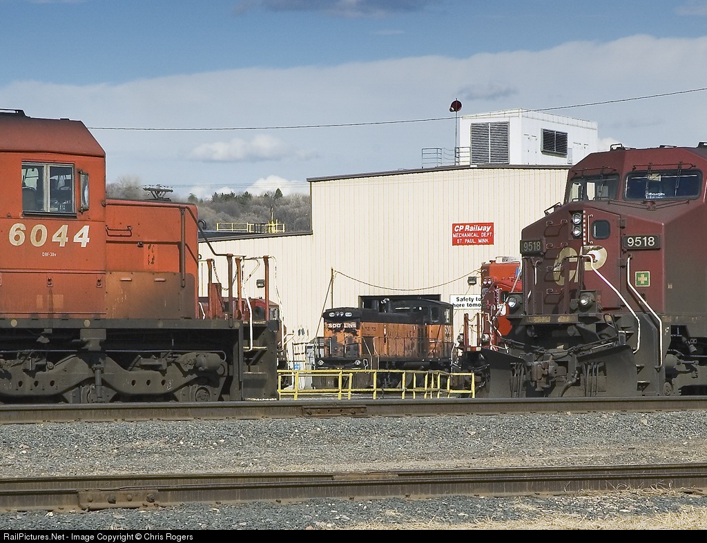 CP 9518 and CP 6044 bookend the Soo 1548 with Milwaukee Road paint in front of the CP offices in St Paul. Three different railroads, three different engines and two different CP paint schemes represented.
