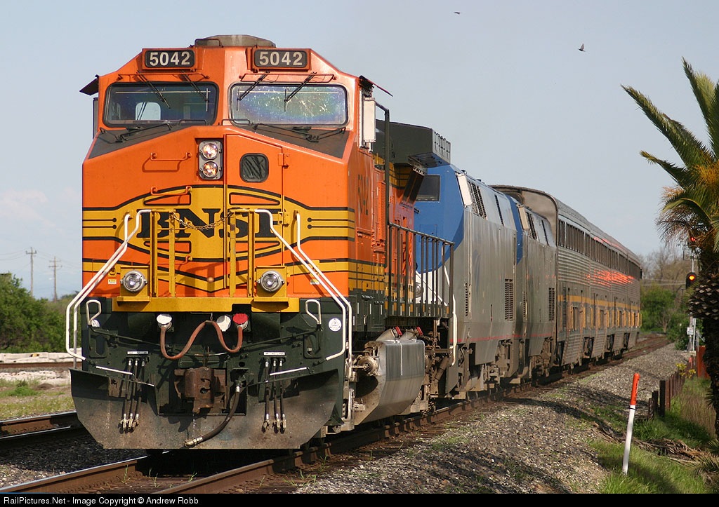 | A strange San Joaquin, 4 cars 2 P42's and a BNSF dash9 5042 on the point, odd that there is only 1 more car than engines |
