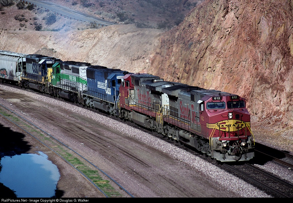 | A colorful lash-up of BNSF 612, BNSF 946, NS (ex-CR) 5409, FURX 3050 and CSX 8446 heads east out of Barstow, California. |