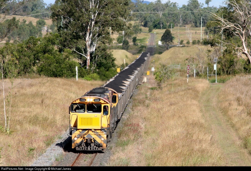 | Coal Train #9811 lead by QR 2388/2338 is photographed here from an overpass at Yarramalow on the Ebenezer Branch. This train will soon make a brief stop to swap the 'section staff' with Coal Train #9E12. |