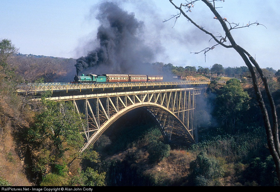 Zambia Rlys 10th class in the livery of the Zambesi Saw Mills Railway, hauls an excursion over the Victoria Falls Bridge.