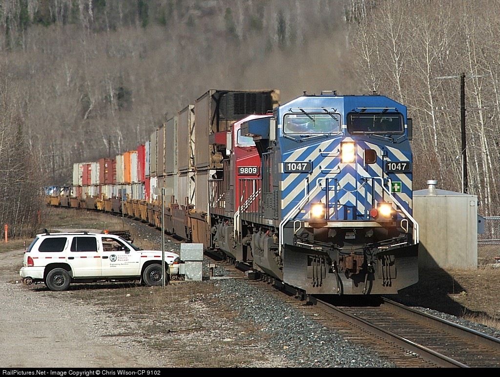 CP #108-CEFX 1047, CP 9809, 80 intermodal platforms, 2 autoracks-328 axles @ 10:30 passes over the hotbox detector. The Durango belongs to a m.o.w. crew member who is doing some work inside the shack.