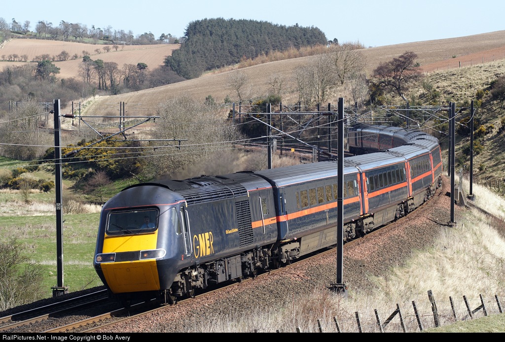 A Kings Cross-Aberdeen 'HST' on the East Coast Main Line in SE Scotland. These diesel powered 125 mph trains run under the wires all the way from London to Edinburgh, then continue on non-electrified lines to Aberdeen or Inverness.