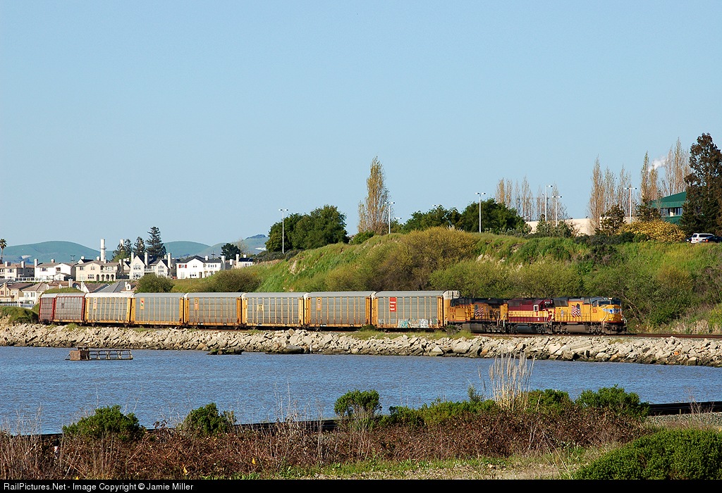 UP 5036 leads a westbound auto train along San Pablo Bay. The Wisconsin Central GP40 2nd out is a long way from home. Nikon D50 Nikon 80-200 2.8