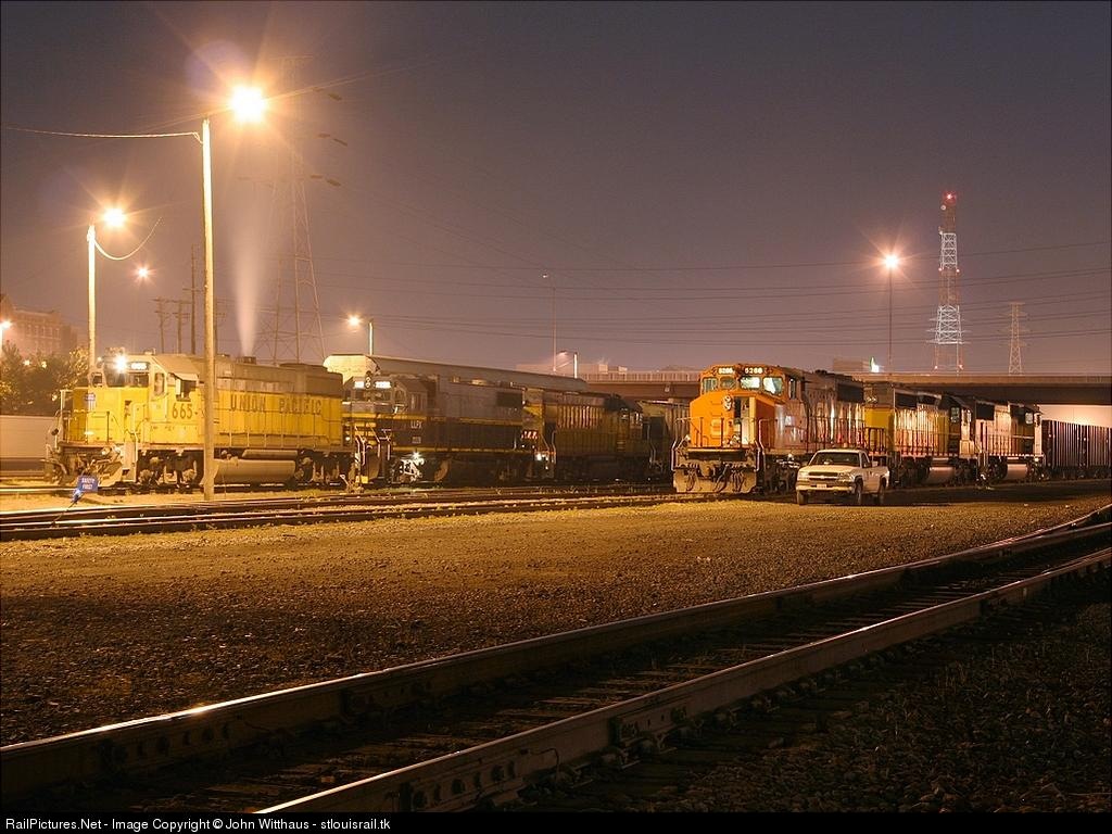 | In the early morning hours, the YDU50 job pulls to a stop in the 12th Street yard with a smoky MoPac GP38. On the next track, a carman is inspecting a CN SD40-2W on another UP train. Canon 350D. 28-80mm. |