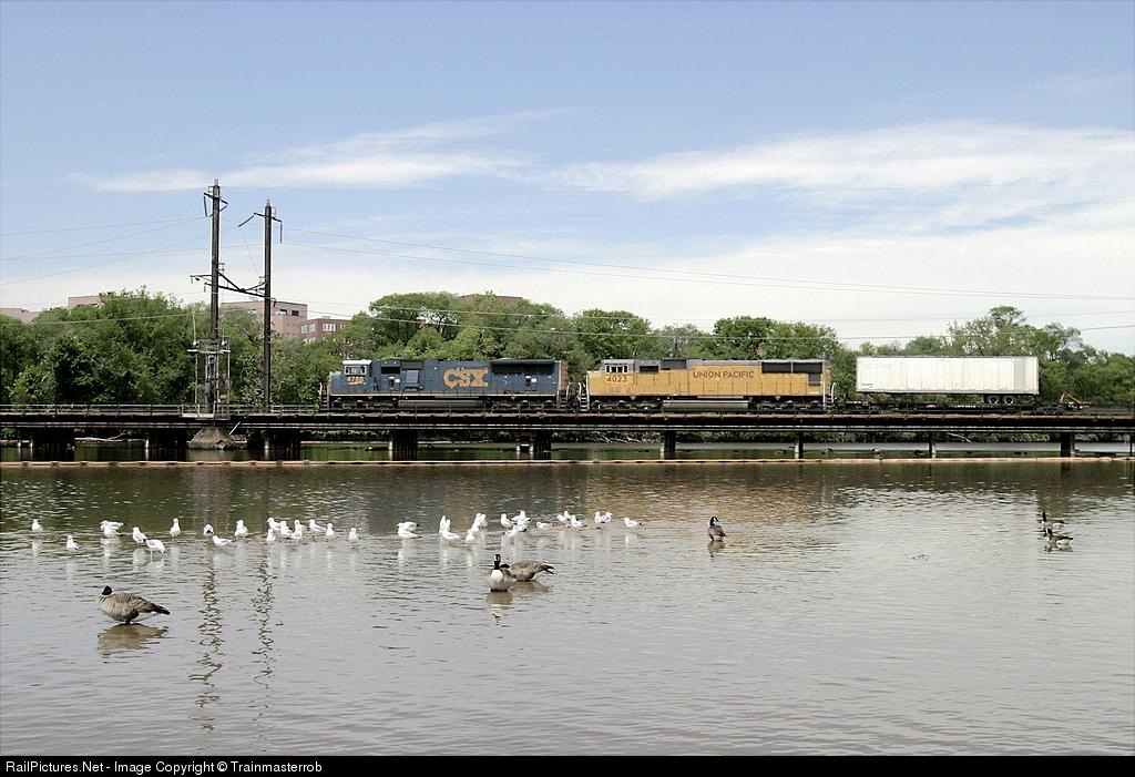 | CSX southbound trailer train, Q173, passes by geese and seagulls playing in a supprisingly clean Anacostia River. |