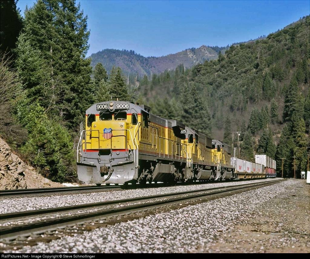 UP C36-7 9006, along with two new SD60s, blasts uphill through the forests of the Feather River Canyon at Virgilia with a long APL stack train bound for Chicago.