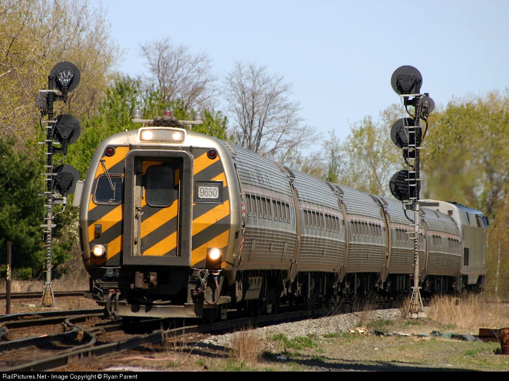| Amtrak cabcar 9650 leads todays Vermonter from St. Albans, VT to New Haven, CT. The train is seen here coming west through CP-96 on the CSX Boston Line. Once it gets to Springfield Station it will then head south on Amtrak's Springfield Line to New Haven. |