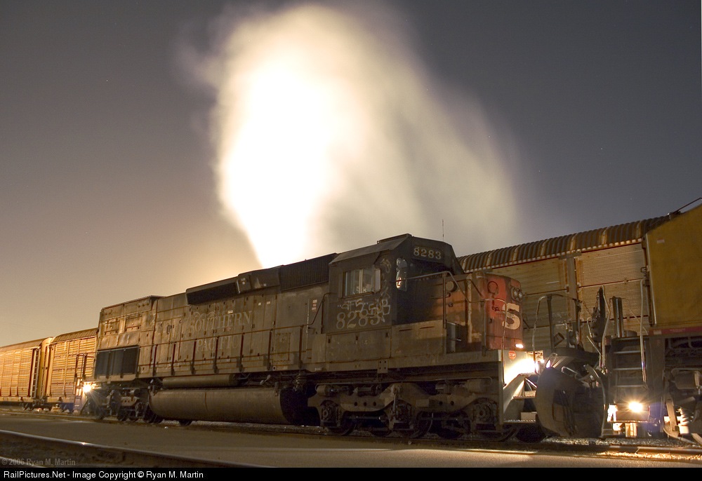 The last unpatched active SP Tunnel Motor (for UP), SP8283, takes a break for a smoke in between autorack train assignments. This is not the first time she's smoked like this. Hmmm, why do I suddenly feel like taking a trip to Yellowstone Nat'l Park?